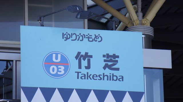 !ゆりかもめ「竹芝」駅。東京湾に面したウォーターフロントであり、伊豆・小笠原諸島への玄関口「竹芝客船ターミナル」があることで知られています。