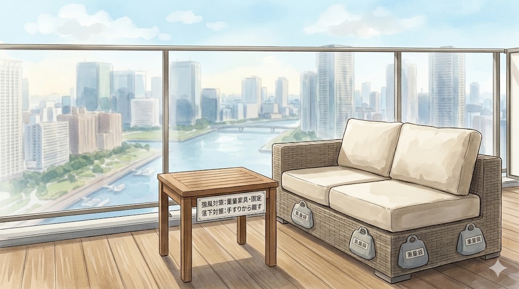 湾岸エリアの高層階では、地上では微風でもベランダでは突風が吹くことが日常茶飯事です。軽量なアルミ製の椅子や、折りたたみ式のテーブルは、一瞬の風で飛ばされる危険があります。 ベランダから物が落下すれば、下にいる人や車に甚大な被害を与え、取り返しのつかない事故になりかねません。「使わないときは必ず室内に片付ける」か、「風に強い重量のある家具を選び、さらにワイヤーなどで手すりに固定する」といった対策が不可欠です。