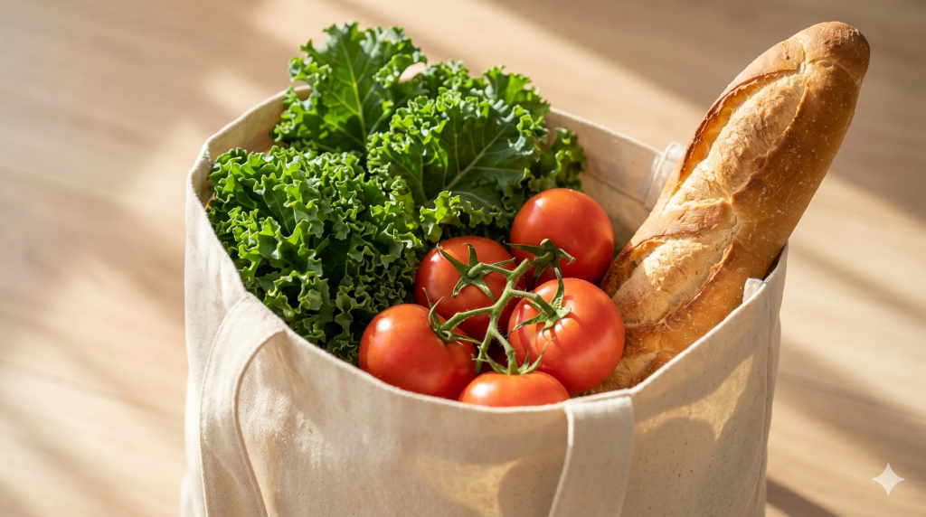 私はいつも、大きめのエコバッグを2つ用意します。1つは重い野菜用、もう1つは潰したくないパンやお花用です。また、保冷剤を入れた小さな保冷バッグがあると、チーズやデリなどの生鮮品も安心して持ち帰れます。